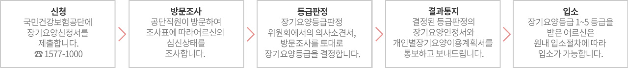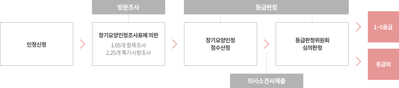 먼저 공단에 장기요양인정신청으로부터 출발하여 공단직원의 방문에 의한 인정조사와 등급판정위원회의 등급판정 그리고 장기요양인정서와 개인별장기요양이용계획서의 작성 및 송부로 이루어집니다.